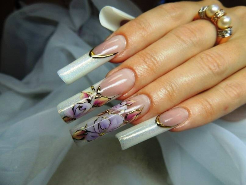 Очень эффектный дизайн наращенных ногтей квадратной формы. С росписью цветами на серебристо-матовой основе белого цвета, и дополнительно декорированного золотым литьём. Маникюрчик высший сорт!