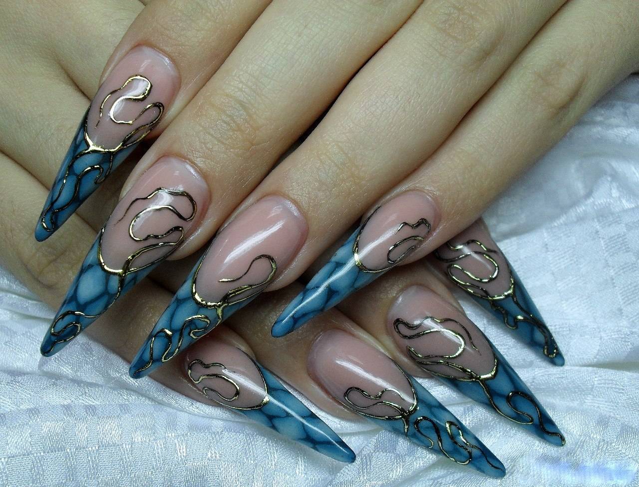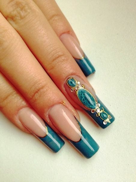 Длинные эффектные ноготки синий френч декорированный золотым литьём.