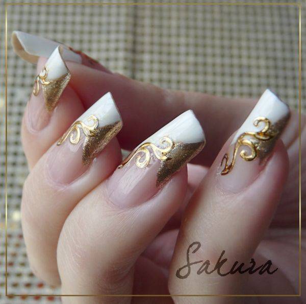 Этот потрясающий нейл-арт полюбился современным модницам больше всего. Золотое литье с белым френчем способное затмить блеск дорогих колец – идеальный вариант для торжественных мероприятий. Наиболее эффектно золото смотрится на коже, покрытой бронзовым или золотистым загаром.