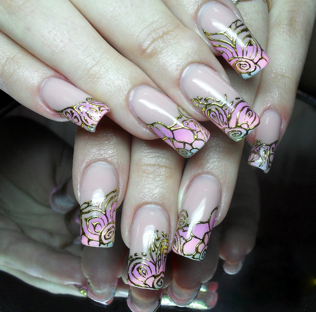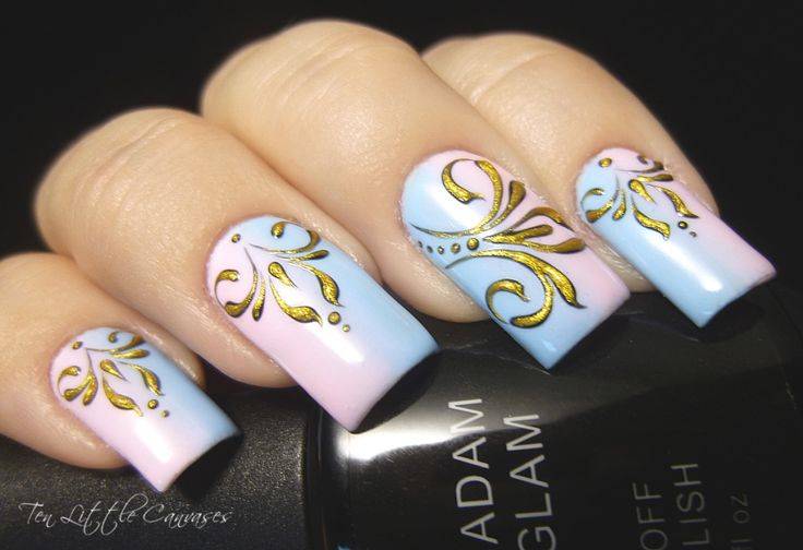 Золотое литьё на ногтях плюс эффект омбре при переходе от нежно розового к нежно голубому.