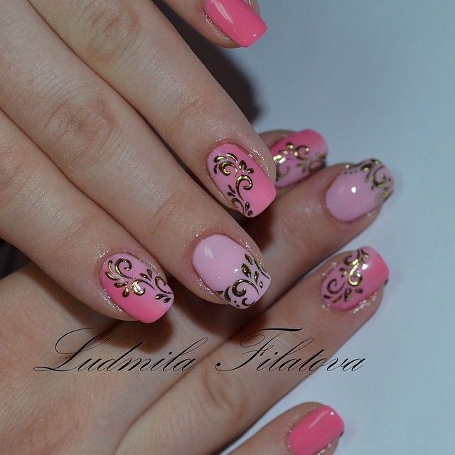 Нежно розовый гель-лак с золотым узором гель-краской на коротких ногтях.