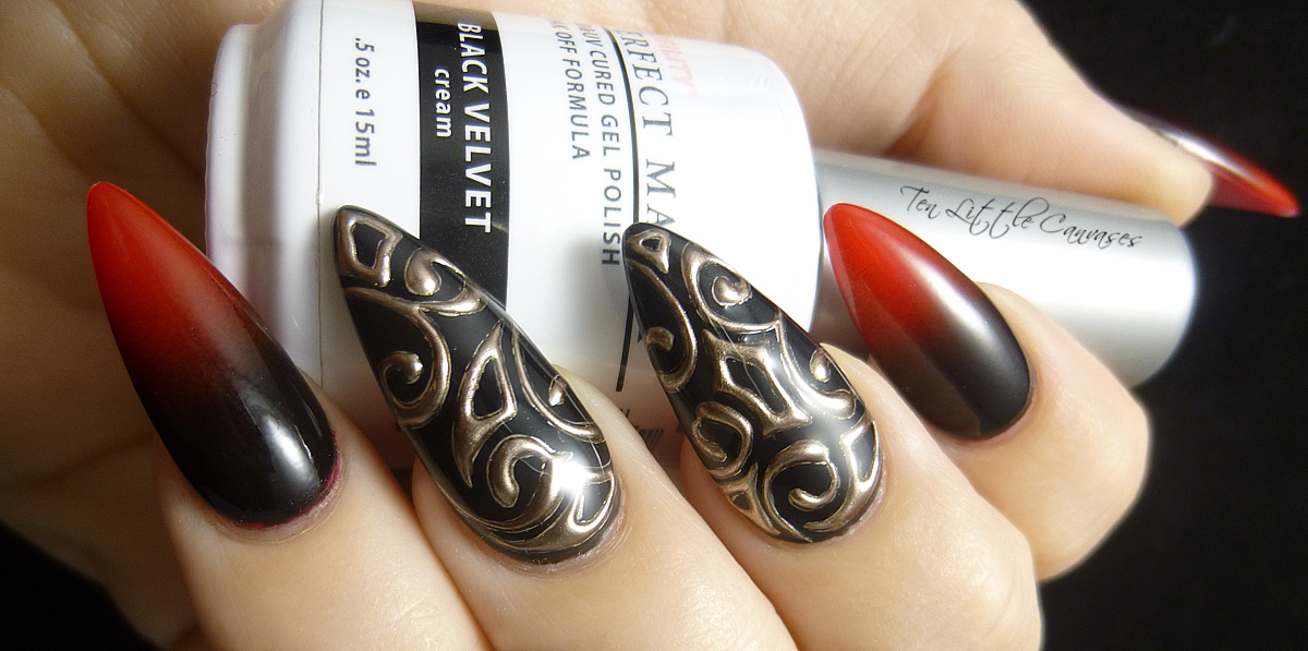 - Шаг 4. Приступаем к прорисовке вензелей. Обыкновенно для этого используют гель-лак черного цвета, который дарит последующему металлическому слою насыщенность и глубину. Готовый рисунок полимеризуем в лампе.