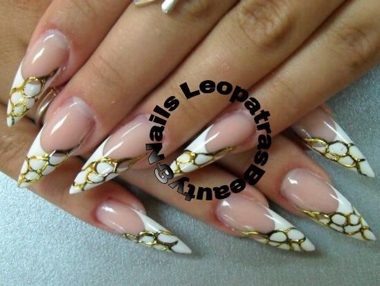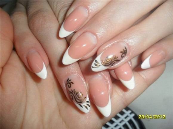 Белый френч на длинных ногтях миндальной формы с золотым литьём. Как правило наиболее популярны золотой и серебряный цвет для данного типа дизайна.