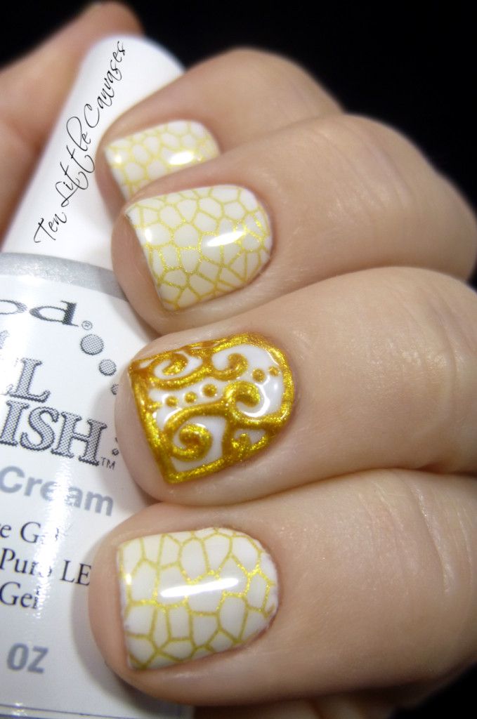 Выпуклый рисунок на коротких ногтях, белый с золотом. Эффект растрескивания.