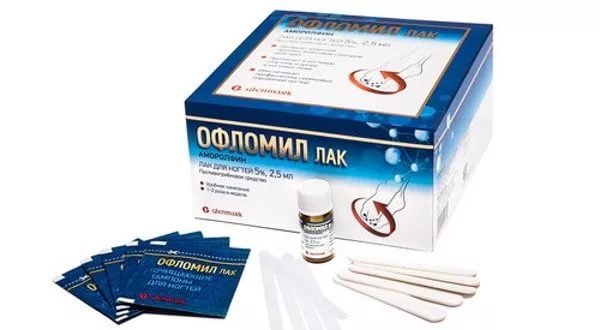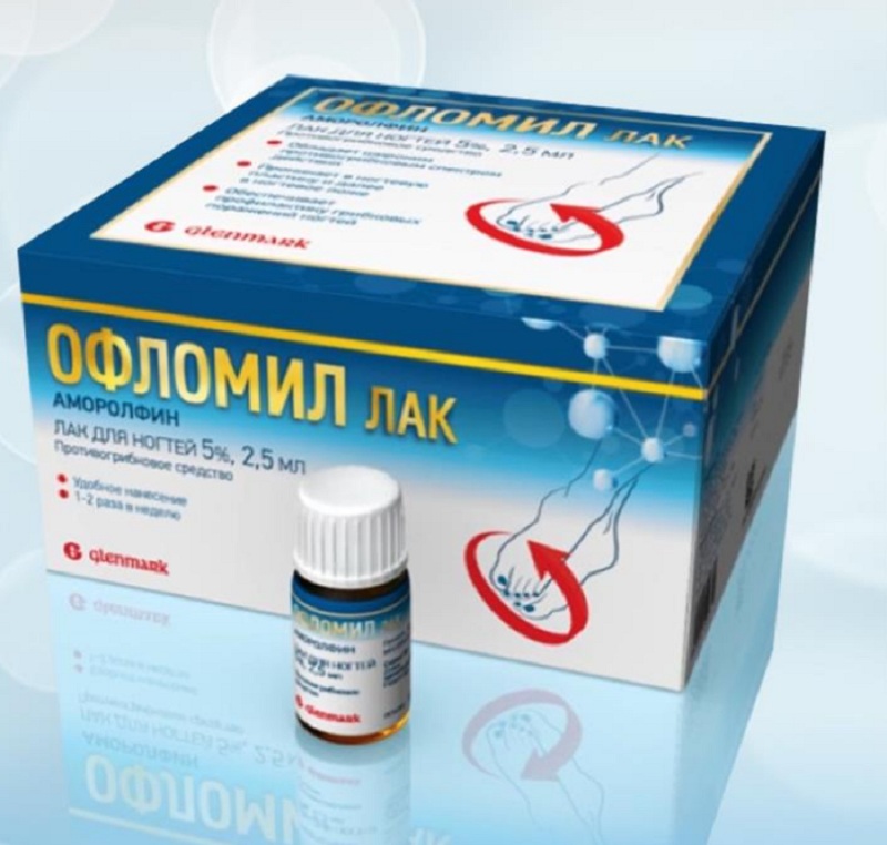 Индийская фирма «Гленмарк» делает 5% лак «Офломил». Он активен против тех же видов грибков, что и лоцерил. Действует за счет аморолфина. Средняя цена 2,5 мл около 750 рублей. Наносить лак надо 1 — 2 раза в неделю, курс лечения от 6 месяцев.