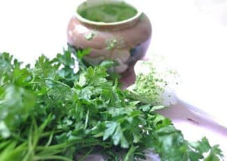 Петрушку мелко порезать и залить кипятком. После настаивания процедить и добавить уксус из яблок. Если его нет, то можно заменить лимонным соком. В этом составе средство хорошо не только для лица, но и для зоны шеи и декольте.