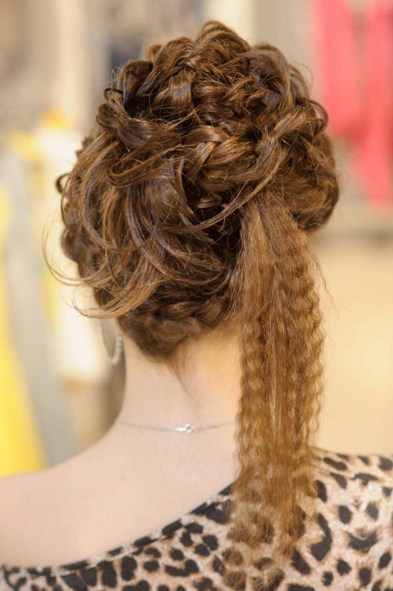 Эффектная укладка для торжественного случая не должна занимать много времени, ведь нужно ещё много всего успеть. Удачный вариант представляет собой 2 части волос уложенные по-разному и объединённые одной общей концепцией. Из правой половины волос сделайте хвост на затылке и завейте его. Слева заплетите обычную косичку. Предварительно вытянув из неё пряди присоедините её к хвосту и пару раз оберните его.