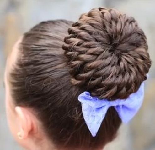 Модные прически на каждый день в виде цветка украсят своим видом торжественный look. Вам понадобиться бублик для пучка, на который необходимо будет накрутить множество мелких жгутиков из конского хвоста. Перед укладкой разогрейте в ладонях немного воска, чтобы оригинальный пучок не превратился раньше времени в колючего ежика.