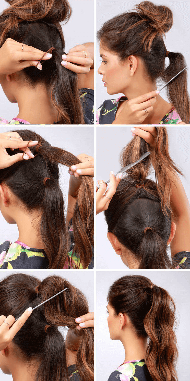 - Расчесать волосы, собрать в высокий хвост и зафиксировать резинкой.