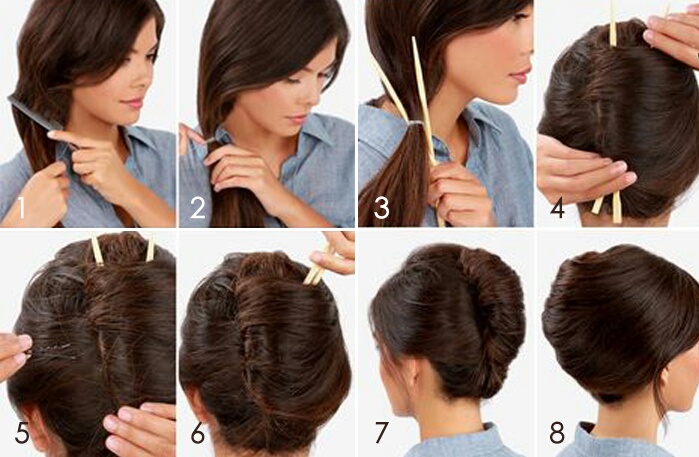 Элегантная ракушка удается не всем девушкам. Зачастую волосы разваливаются и не собираются валиком нужной формы. Предлагаем интересный вариант знаменитой укладки, который легко сделать в любых условиях. Кончики волос нужно собрать за спиной резинкой. Перекинув их через плечо, зажмите резинку между палочками для суши и скрутите валик, туго наматывая волосы. Наглядно техника исполнения выглядит как на фото ниже: