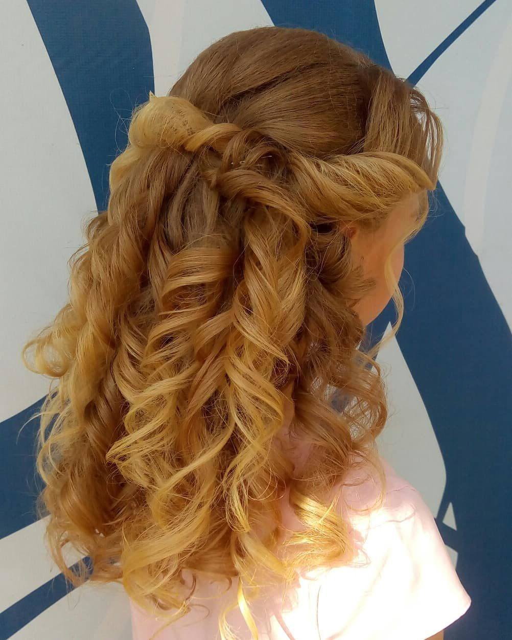 Этот романтический образ подойдет милым и нежным, и достаточно юным. Свободно свисающие по бокам волосы можно пригладить утюжком, а можно накрутить крупными прядями на плойку для получения легких волн.