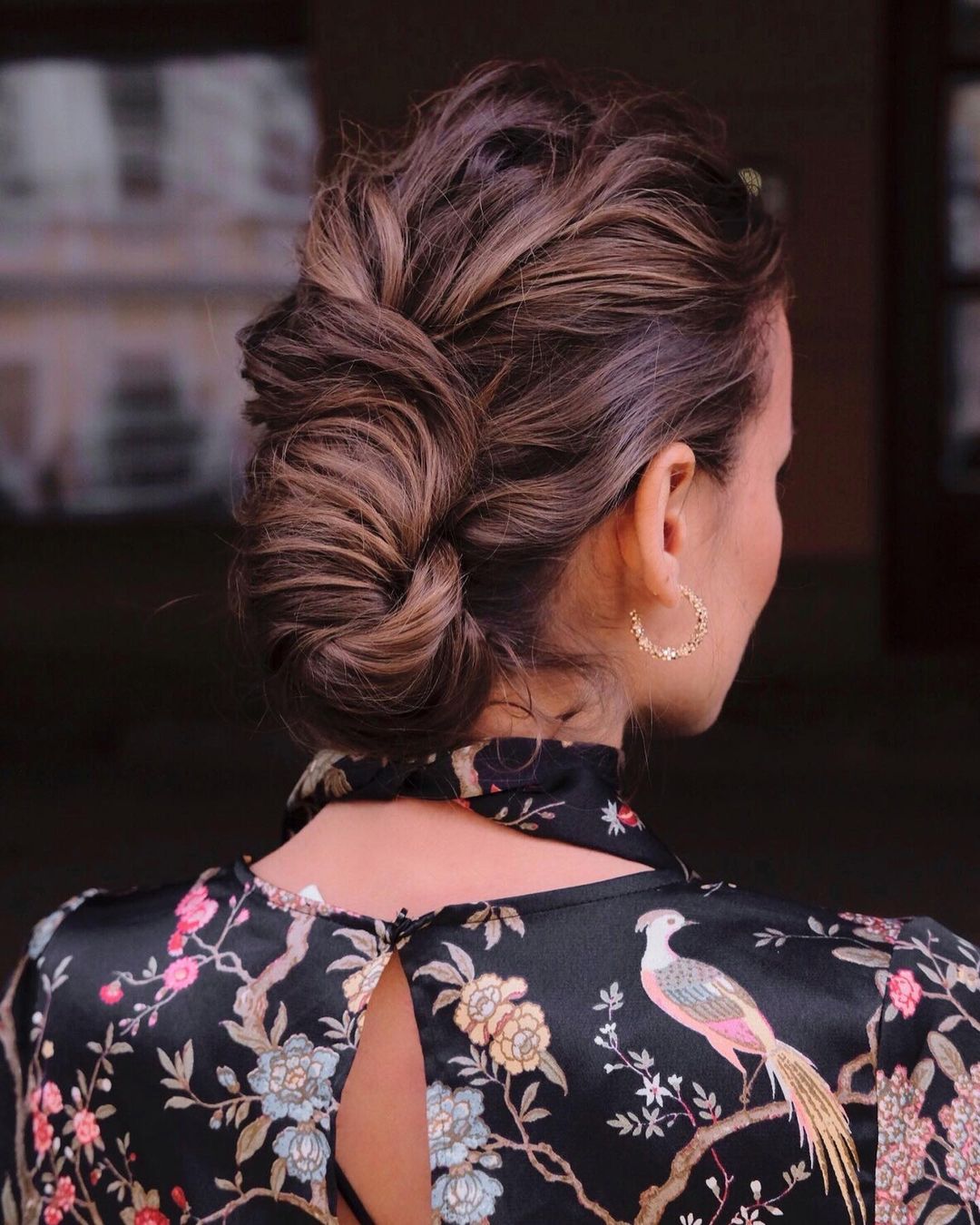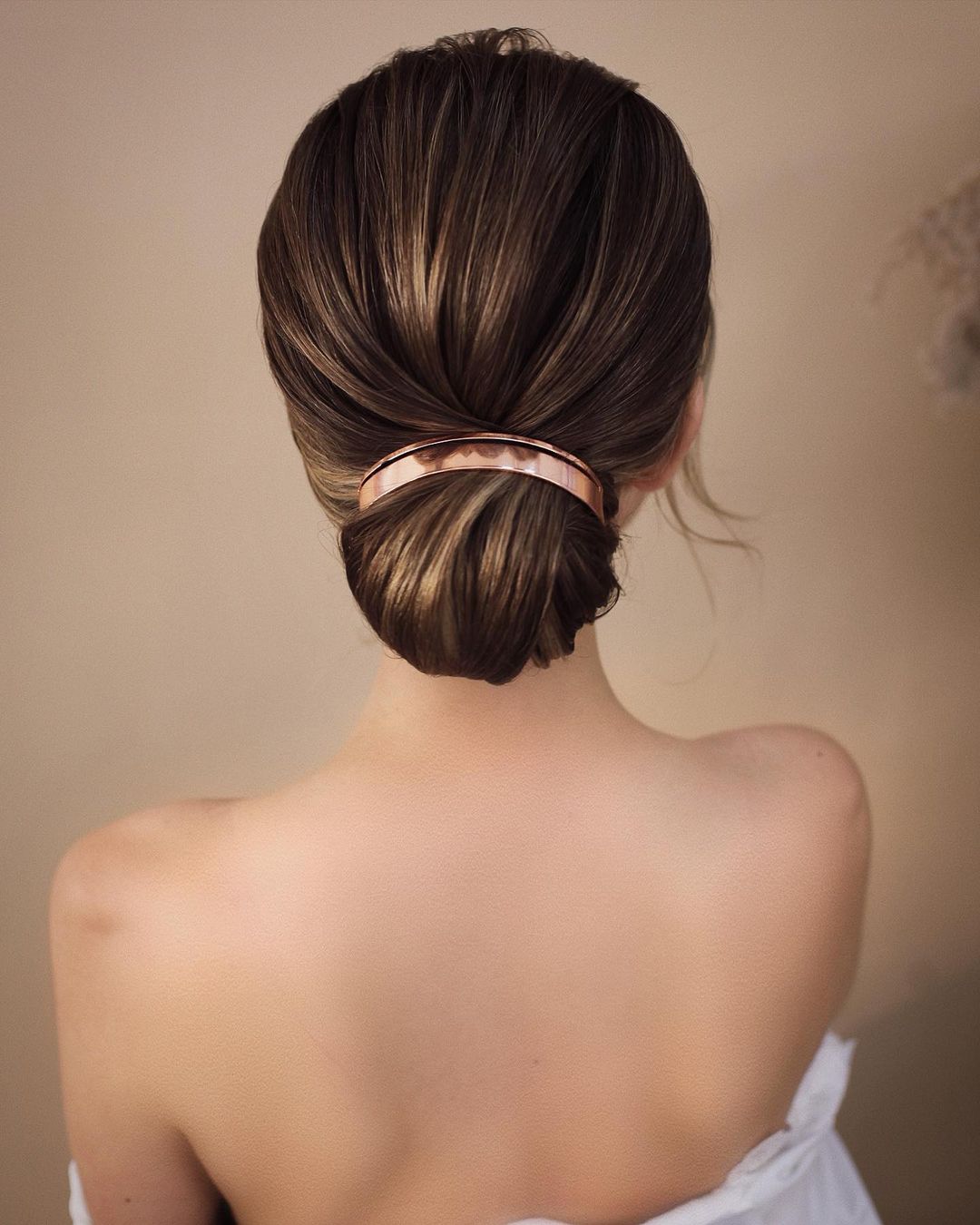 Любимая укладка голливудской красотки Anne Hathaway встречается в портфолио практически у каждого знаменитого мастера по созданию причесок. Но как сделать простую прическу в домашних условиях? Отделите прядь у лба и височной области с правой стороны и закрепите ее зажимом. Остальные волосы соберите в аккуратный нижний пучок. Освободите правую часть волос от зажима и укладывая легкой волной заведите ее под пучок. Украсьте шпильками с жемчужинами и вытяните расческой отдельные пряди для придания фактуры. Такой вариант универсален, он отлично подойдет как на свадьбу, так и на деловую встречу.