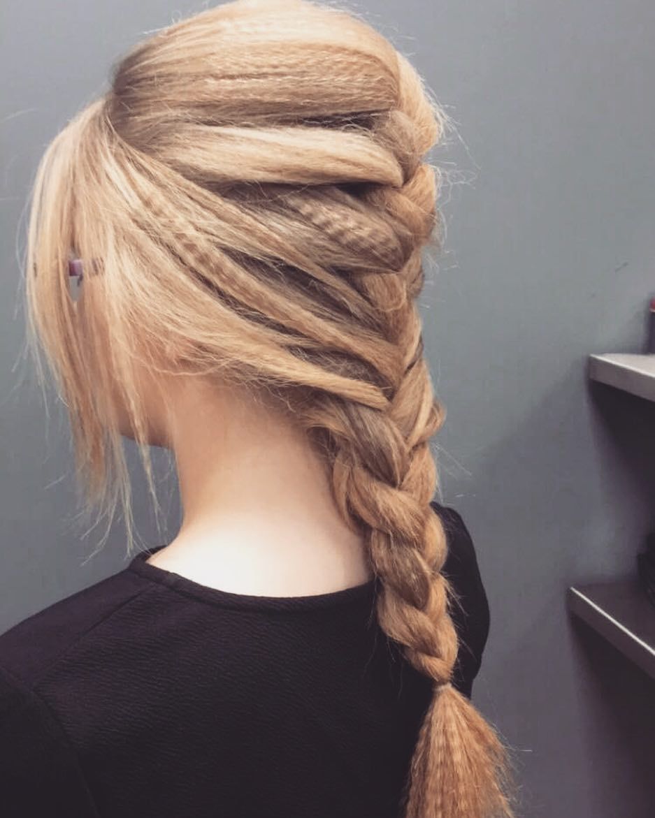 - Через соединенные волосы аккуратно продеть полученный хвост, как показано на фото. Приступить к плетению нетугой косы.