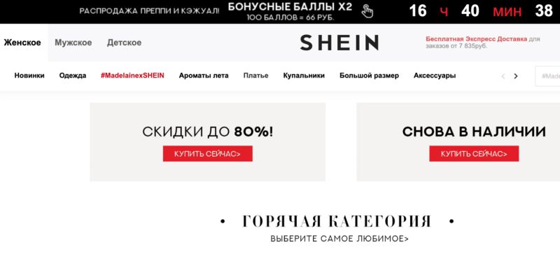 Здесь вы сможете отыскать женскую, мужскую и детскую одежду, обувь и аксессуары, заглянуть во вкладку с распродажами и получить дополнительные скидки.