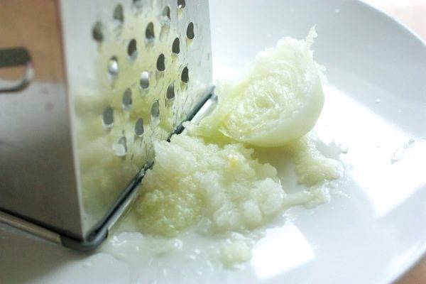 Измельчённый лук с помощью тёрки, который используется для приготовления смеси против выпадения волос