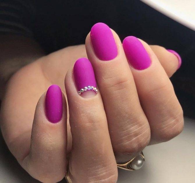 - Завершающий этап. Дугу у основания ногтя покрывают контрастным лаком или оставляют бесцветной. На акцентные ноготки наклеивают стразы или другой декор. Покрывают все пластины прозрачным финишем.