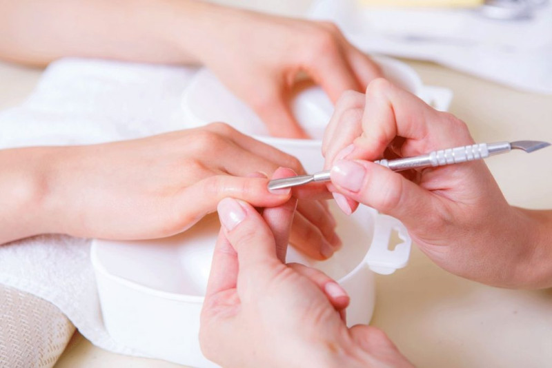 - Уход. Выполняют стандартный гигиенический маникюр – убирают птеригий, отодвигают кутикулу, удаляют огрубевшие участки, шлифуют кожу на боковых валиках. Пилкой придают ноготкам нужный размер и форму.