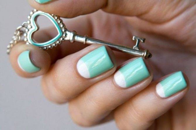 Чтобы сделать лунку, берем кисточку и небольшой отрезок фольги, на который наливаем немного голубого лака. Рисуем на ногте луночку, стараясь сделать максимально ровно, точно и аккуратно. Небольшой секрет, как сделать ровные края: поставьте 3 точки – одну в центре ногтя на высоте, где будет проходить линия, две по бокам, немного ниже относительно центральной. Соедините точки плавными линиями, а для получения треугольного лунного маникюра – прямыми.