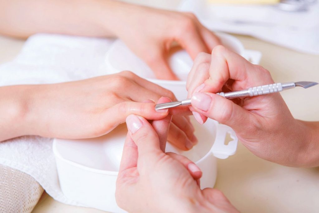 - Уход. Выполняют стандартный гигиенический маникюр – убирают птеригий, отодвигают кутикулу, удаляют огрубевшие участки, шлифуют кожу на боковых валиках. Пилкой придают ноготкам нужный размер и форму.