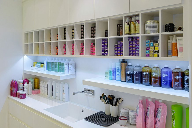 Шкафы-лаборатории экономят пространство в маленьком помещении. Фены, краски, косметика, расчески, другие мелочи требуют места для хранения. В небольших парикмахерских их часто некуда складывать. Подобные конструкции позволяют оптимально использовать площадь, так как вмещают множество необходимых инструментов.