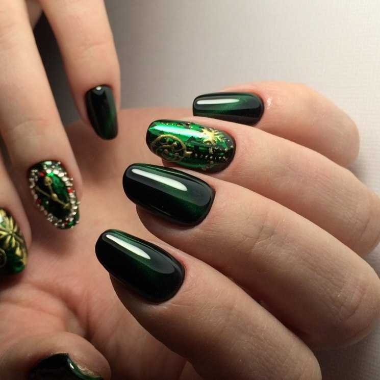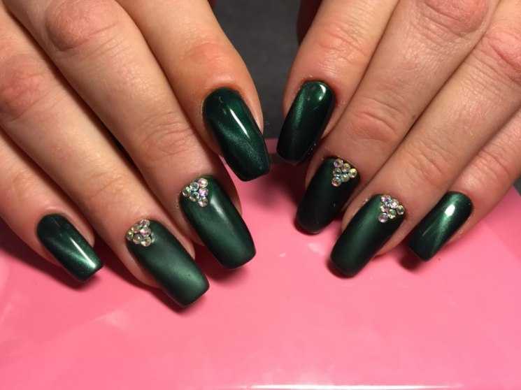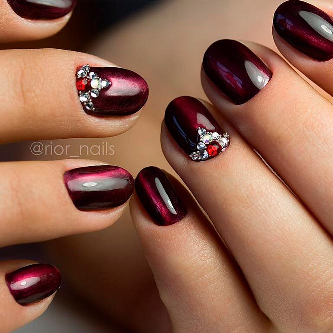 Сама по себе техника «кошачий глаз» предполагает яркий и привлекающий взгляды эффект, но для придания еще большей нарядности можно использовать стразы, наклейки для ногтей, лепнину или другие элементы декора.
