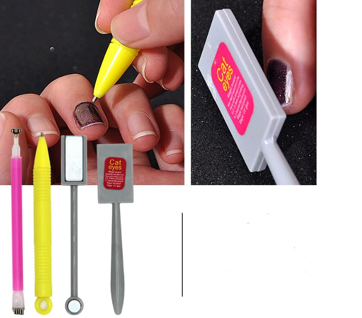 Магнит структурирует металлические частицы в покрытии и выстраивает форму блика. Сегодня на рынке представлено огромное множество форм и видов магнитов для создания маникюра кошачий глаз: простые прямоугольные, с готовыми узорами, круглые и даже в виде ручек. С помощью последних можно отрисовать особенно сложные формы.