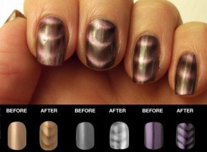 Магнитный лак для ногтей имеет отличие от обычного лака, что в нем содержатся маленькие частички металла. В продаже к лаку прилагается специальная пластинка с магнитным узором. В основе технологии нанесения магнитного лака лежит свойство магнита притягивать к себе металл. Когда мы преподносим магнитную пластинку к еще невысохшему слою лака на ногте, то металлические частицы, содержащие в лаке, начинают реагировать на магнит, в результате чего на ногтевой пластине возникает эффектный узор. Рисунок зависит от узора магнита. Это могут быть волны, поперечные полоски, диагональные полоски или продольные, полоски вида лучей которые расходятся из центра ногтевой пластины. Благодаря магниту рисунок выходит с эффектом размытости, а также получаются плавные переходы.
