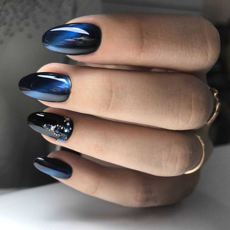 Особенно эффектно смотрится покрытие, нанесенное поверх темных подложек. Эксперты советуют первое покрытие делать гелем черного, темно-синего и вишневого оттенков.