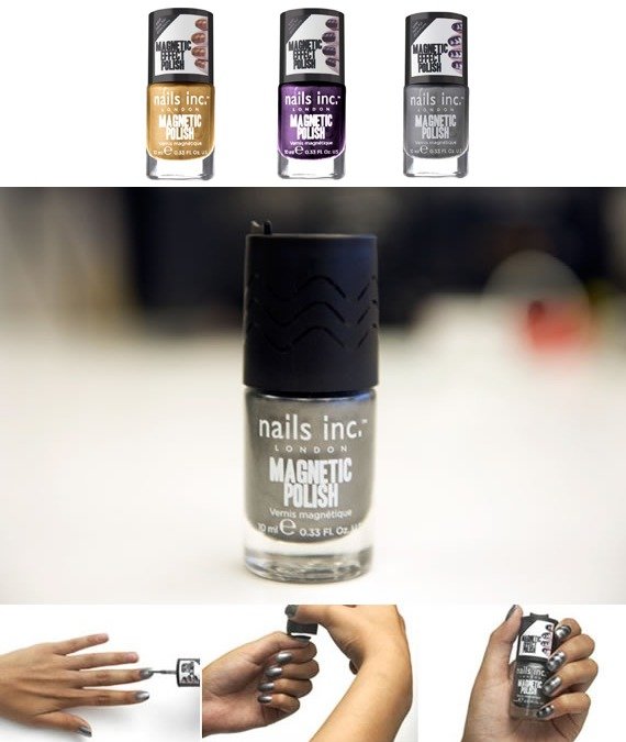 Британская торговая марка Nail Inc среди маникюрных покрытий выпускается отдельную линейку магнитных лаков. Магнит, используемый для создания рисунка, вмонтирован в колпачок. Выбирать расстояние от магнитного блока до ногтевой пластины не нужно. Достаточно приблизить к ноготку (немного ниже кутикулы) колпачок с той стороны, где имеется выступ. После 5 секундной выдержки на поверхности проявляется интересная картинка в трёхмерном изображении.