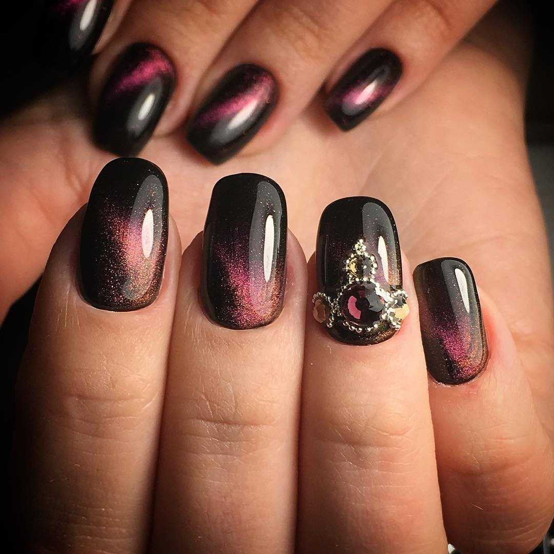 Привлекательную глубину и выразительность покрытию можно придать путем нанесения слоя темного оттенка шеллака сразу же после базы. Магнитные узоры можно создавать на каждом слое. Так переливы станут более загадочными и мистичными.