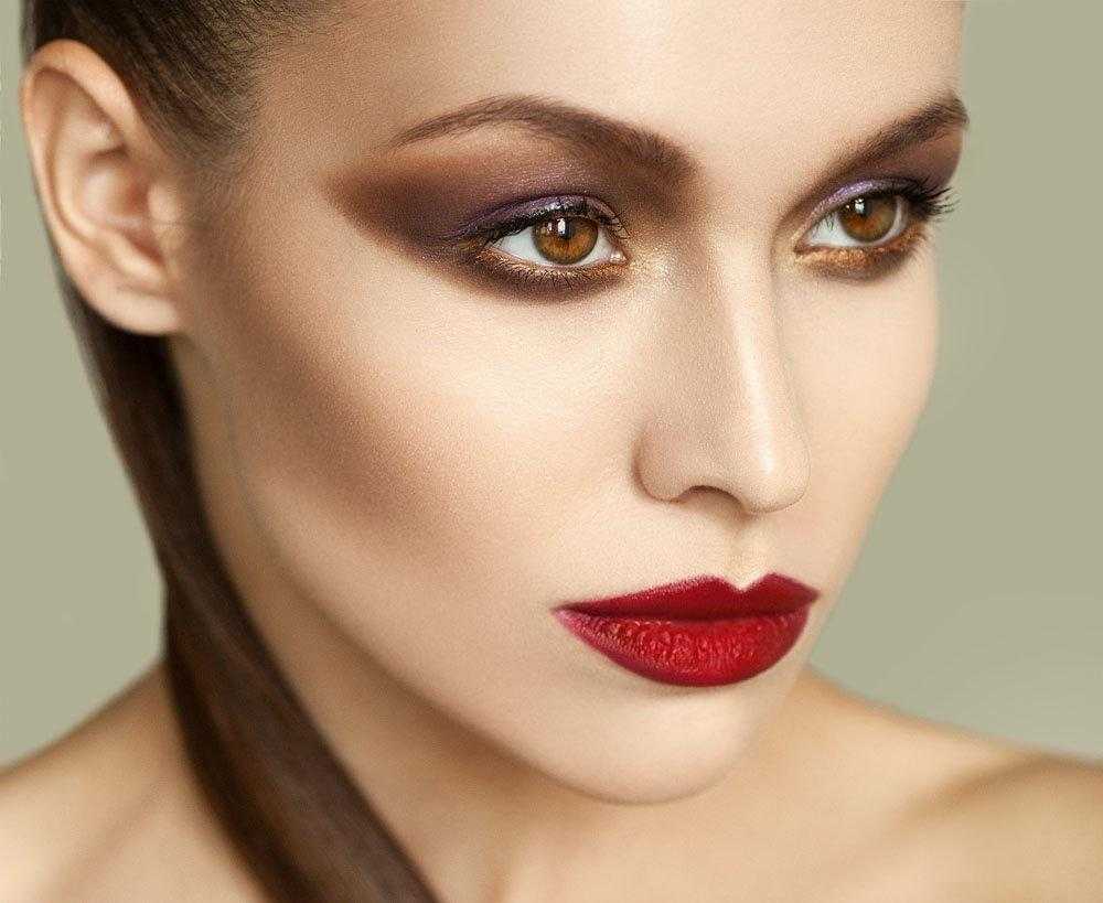 Повторяем первые 5 шагов, а губы красим помадой более яркого оттенка – темно-розовой, коричневой или красной, предварительно сделав контур карандашом того же цвета.