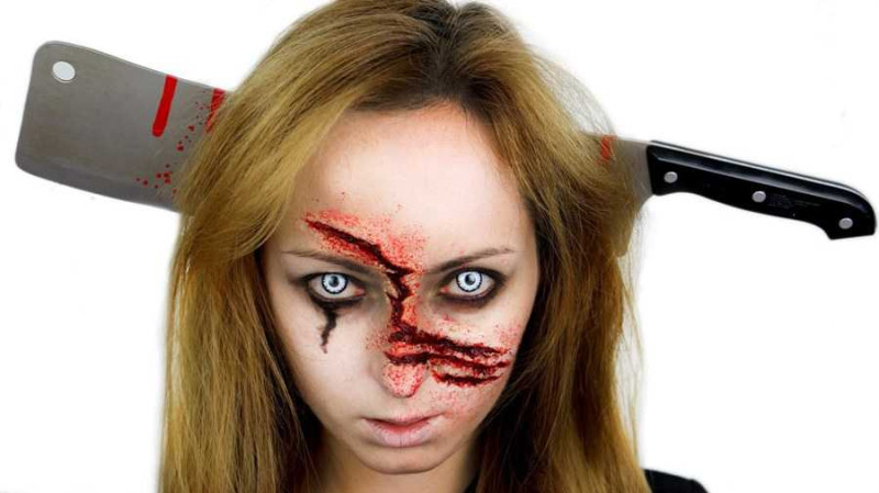 - Шрамы можно сформировать, если смешать черный карандаш и темно-алую губную помаду. Ей же накрасьте и губы.