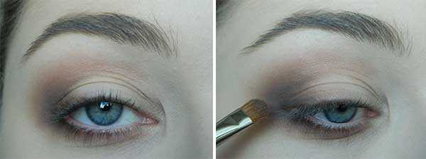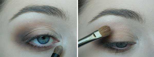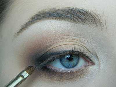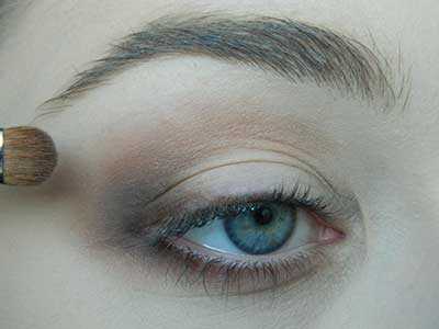 1) на все верхнее веко до бровей наносится базовый, самый светлый оттенок теней;