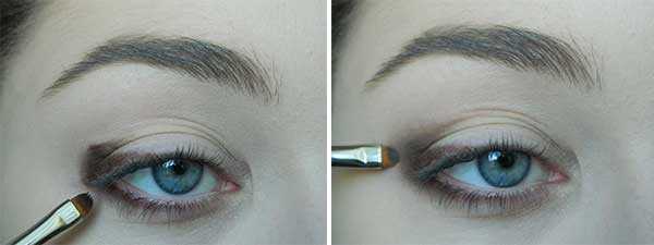 Первым делом нужно нанести самые светлые тени на все веко и растушевать. Затем вооружится самым темным оттенков, и прорисовать им линию в складке века, визуально разделяя его на подвижно е неподвижное. Тем же темным оттенком выделяем нижнее веко, соединяя линию с верхней, закругляя ее. Форма глаз получается продолговатой, и напоминает форму банана.