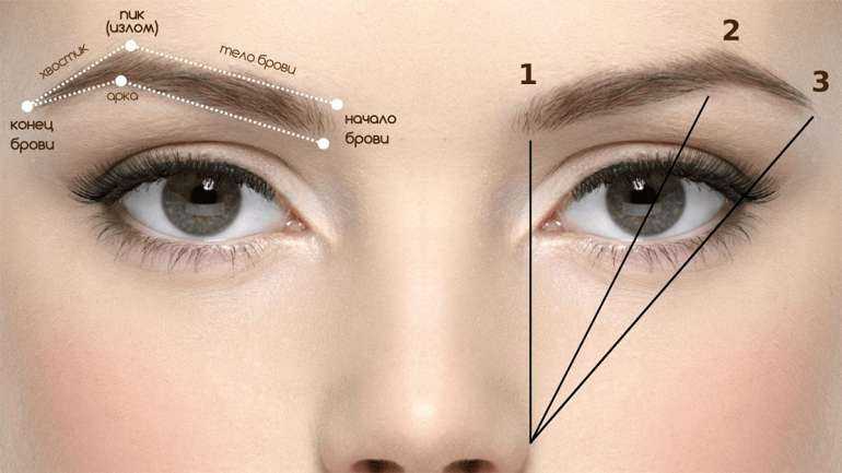 - Высшая точка брови, от которой берет начало хвостик. Линию нужно нарисовать от внешнего края ноздри до брови через зрачок. Точка ставиться на веке под бровью.