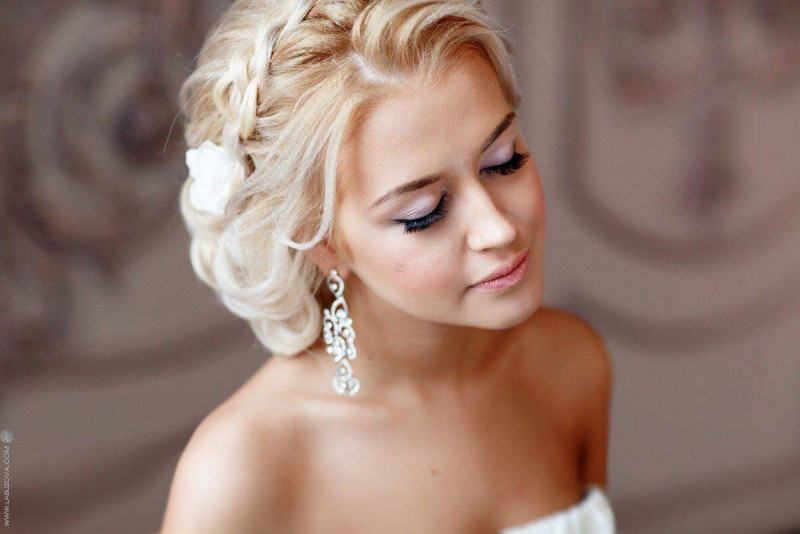 Невеста не должна делать чересчур яркий макияж. В данном варианте подойдет обычный естественно-свадебный тип. Как правило, для его выполнения используются нюдовые или кремовые оттенки.