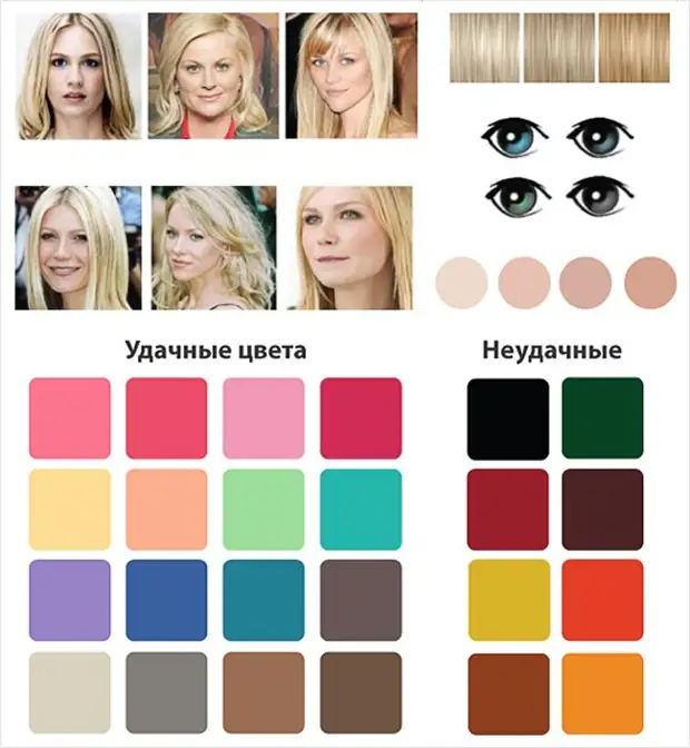 Глаза могут быть серо-голубыми, зелеными, светло-карими, голубыми. Главная особенность — в любом оттенке глаз будто бы присутствует легкая дымка. Чем цветотип «Лето» отличается от «Весны»? Цветом кожи, поскольку «летний» колорит светлый и холодный, без теплого подтона. Также у «Лета» встречаются как белокурые, так и темные волосы, а у «Весны» больше распространены более светлые медовые пряди.