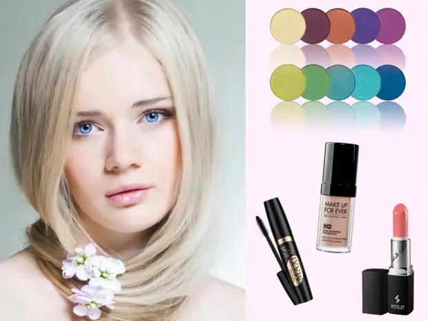 Для обладательниц светлой кожи используются светлые оттенки палитры. Чтобы подчеркнуть глаза на веко наносятся шиммерные тени в персиковом или тауповом цвете. Хайлайтер шампанского оттенка выделит брови. На щеки наносятся румяна медового и абрикосового цвета. Бежево-розовый бальзам для губ отлично подойдет для блондинок со светлой кожей.