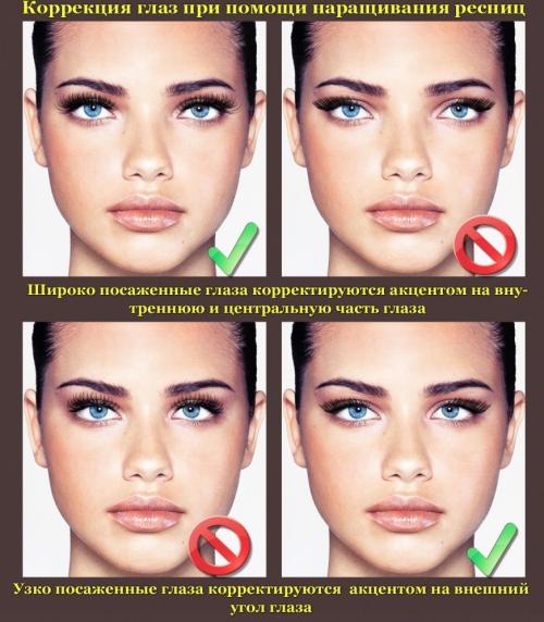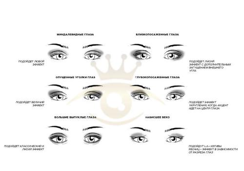 Близко посаженные глаза. Девушкам с такой формой и разрезом глаз подойдет любой эффект обязательно с загущением внешнего уголка (лисий, беличий). Так же, подобную форму глаз, можно корректировать правильно подобранной длиной ресниц.