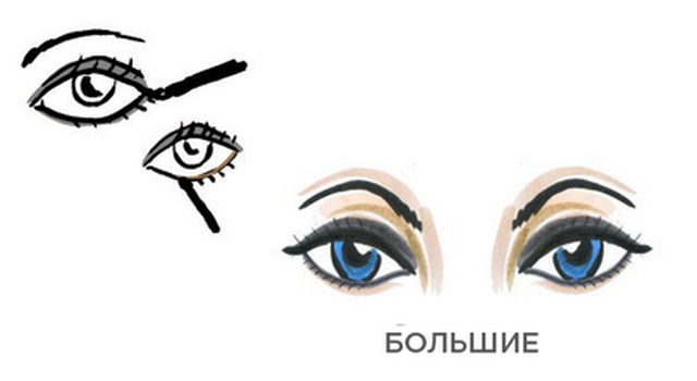Такая косметика подчеркнет выразительность глаз и сделает их большими. Чтобы придать им объем, можно светлые тона посредством растушевки вывести вверх, к области бровей. Тогда визуально разрез будет расширяться.