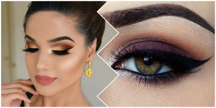 - Тёмные тени в натуральных оттенках (коричневые, чёрные, серые) для стрелок и затемнения внешнего уголка.