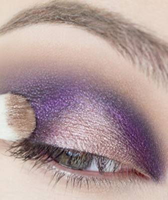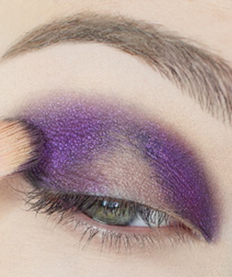 - Фиолетовым цветом выделите внешний уголок века и плавно растушуйте этот оттенок в центральном направлении.