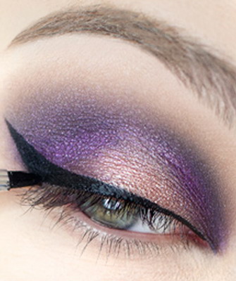 - На нижнем веке используйте перламутровые ярко-фиолетовые тона, аккуратно проведя по нижним ресничкам.