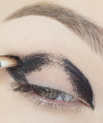 2 Складку верхнего века и всю подбровную область подчеркните сияющими темно-коричневыми тенями так, чтобы растушевка получилась дымчатой. Не бойтесь переборщить — макияж должен быть достаточно «размашистым».
