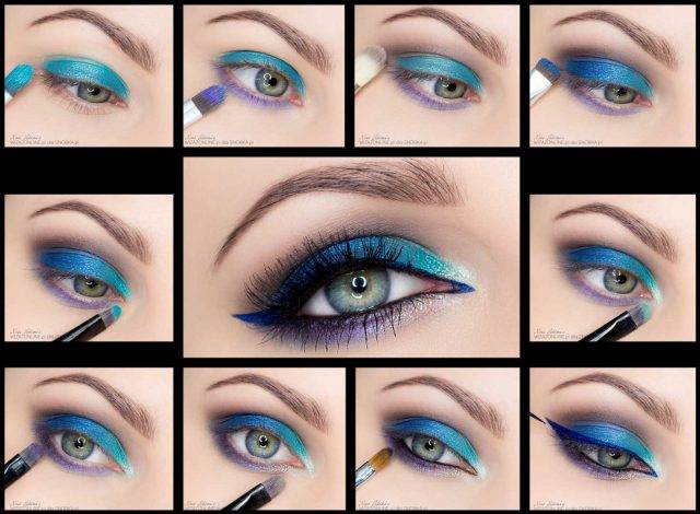 Чтобы придать взгляду притягательности, на веки можно нанести голубые тени с дымчатым отливом. На верхнюю часть века наносят более темные тени, делая плавный переход к светлому оттенку. Светлые тени наносят на нижнее веко, этот же цвет декоративной косметики равномерно распределяется до линии брови. Для придания глазам большей выразительности, в их уголки можно нанести темные тени. Поверх теней по линии роста ресниц на веках следует нарисовать тонкую линию стрелок, используя черную подводку.