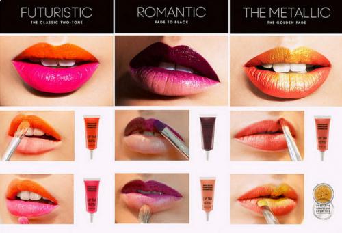 Вертикальный. а) слева светлый — справа тёмный (и наоборот). Но такой вариант практически не используется, так как вид получается слишком странный, годящийся скорее для фотосессии;)б) светлый между двумя тёмными — создаёт эффект более объёмных губв) тёмный между двумя светлыми — создаёт эффект уменьшения губ.Разумеется, это не все методы: можно использовать несколько совершенно разных оттенков, можно расположить их в произвольном порядке, можно хоть по диагонали градиент сделать;о) Только не забывайте, что такой макияж губ будет годиться не для повседневной жизни и не для важных случаев, а скорее для фотосессий или тематических вечеринок…