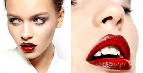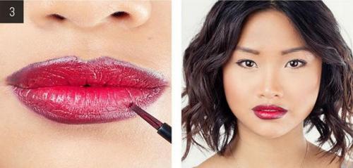 Шаг 3 – нанеси на губы помаду или блеск ярко-красного цвета При помощи специальной кисти для помады нанеси на губы ярко-красную, вишневую, алую или бордовую помаду, начиная с середины губ. Равномерно прокрась контур губ, чтобы не было видно черного карандаша. Закрепить макияж губ можно при помощи бесцветного блеска для губ.