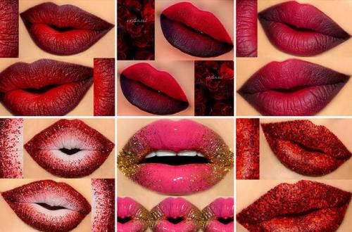 Омбре на губах может быть горизонтальным, вертикальным, только на одной губе, выполненным в самых разных цветовых сочетаниях и текстурах.