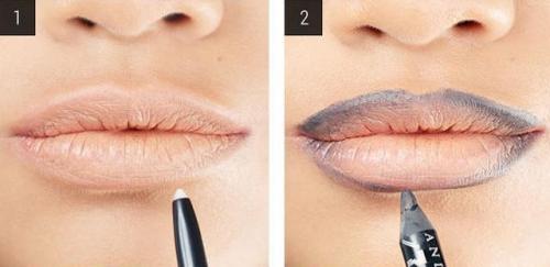 Шаг 2 – прорисуй контур губ темным карандашом При помощи черного карандаша для глаз или темно-красного для губ нарисуй контур губ. Уголки губ можно прорисовать чуть жирнее, а середину прокрасить, едва касаясь. Должен получиться эффекта градиента.
