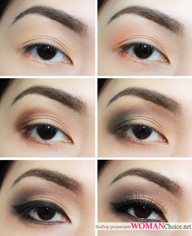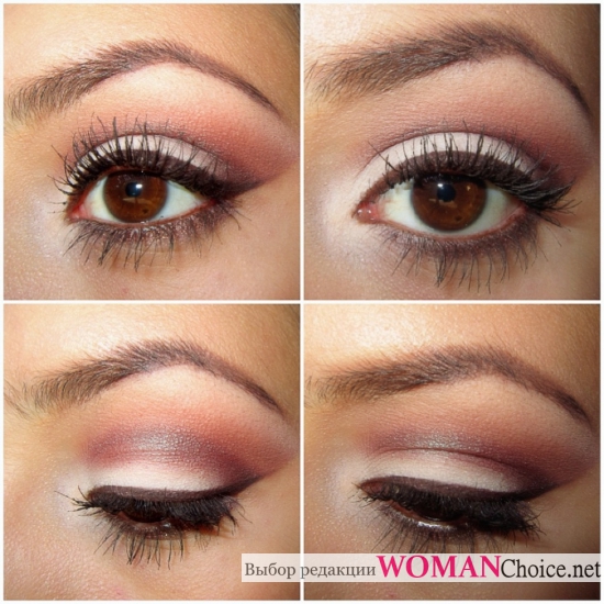 Предлагаем ознакомиться с поэтапной методикой самостоятельно нанесения темного макияжа для карих глаз:
